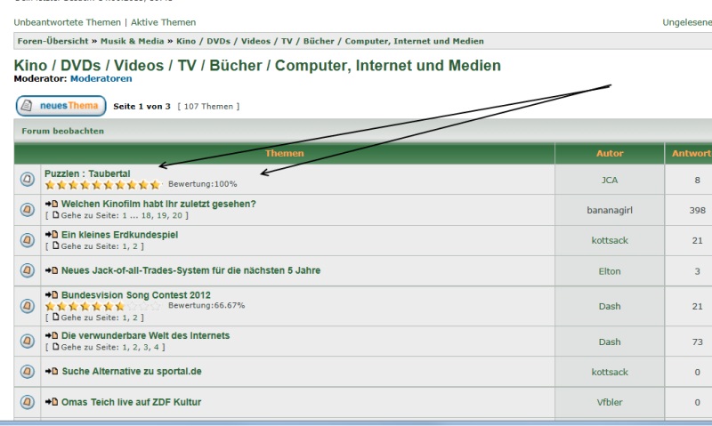 Das gilt dann forenübergreifen. Aber interssiert das, dass Thema 1 (Band XY) insgesamt eine Bewertung von 5,40% , ein anderes hema aus dem OFF-Topc bereich aber 3,40%. Ich meine Nein, verwirrt nur.